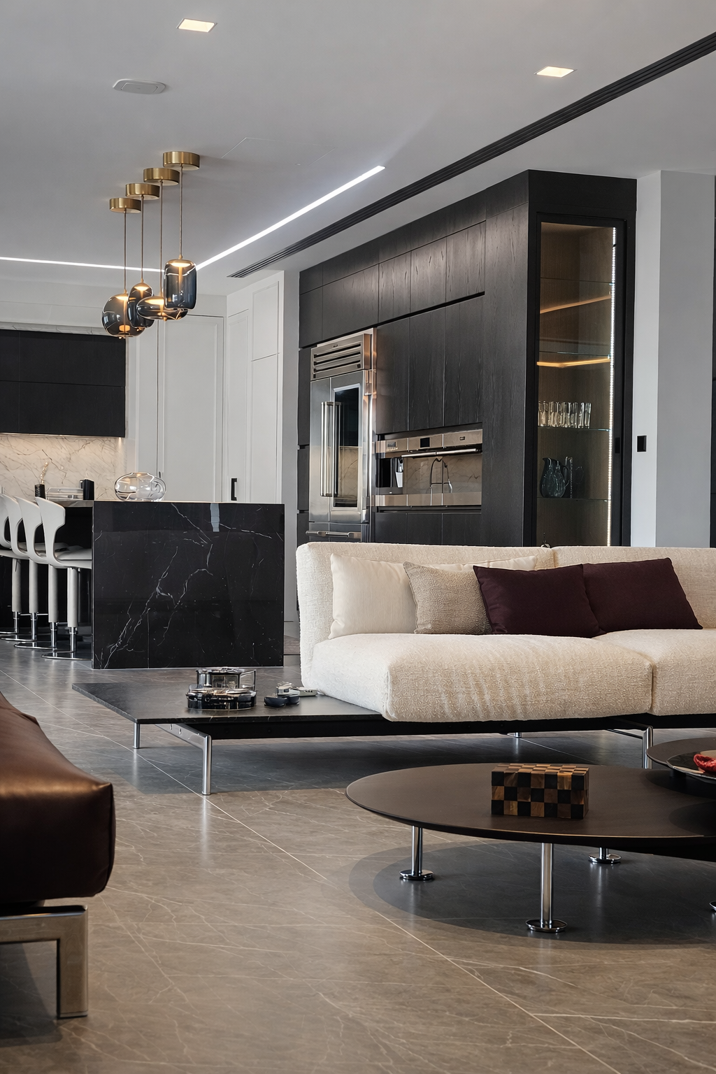 In crafting the TV unit for the family living area, we drew inspiration from classical architecture, blending opulence with restraint to create sophisticated and contemporary spaces. Clean lines, neutral palettes, and luxurious materials like Pietra grey marble and dark grey stained wood were meticulously chosen to prioritize both aesthetic appeal and functional comfort. This harmonious fusion results in bespoke experiences that encapsulate the essence of timeless and modern living, offering a refined yet inviting atmosphere for the family to relax and unwind in style.