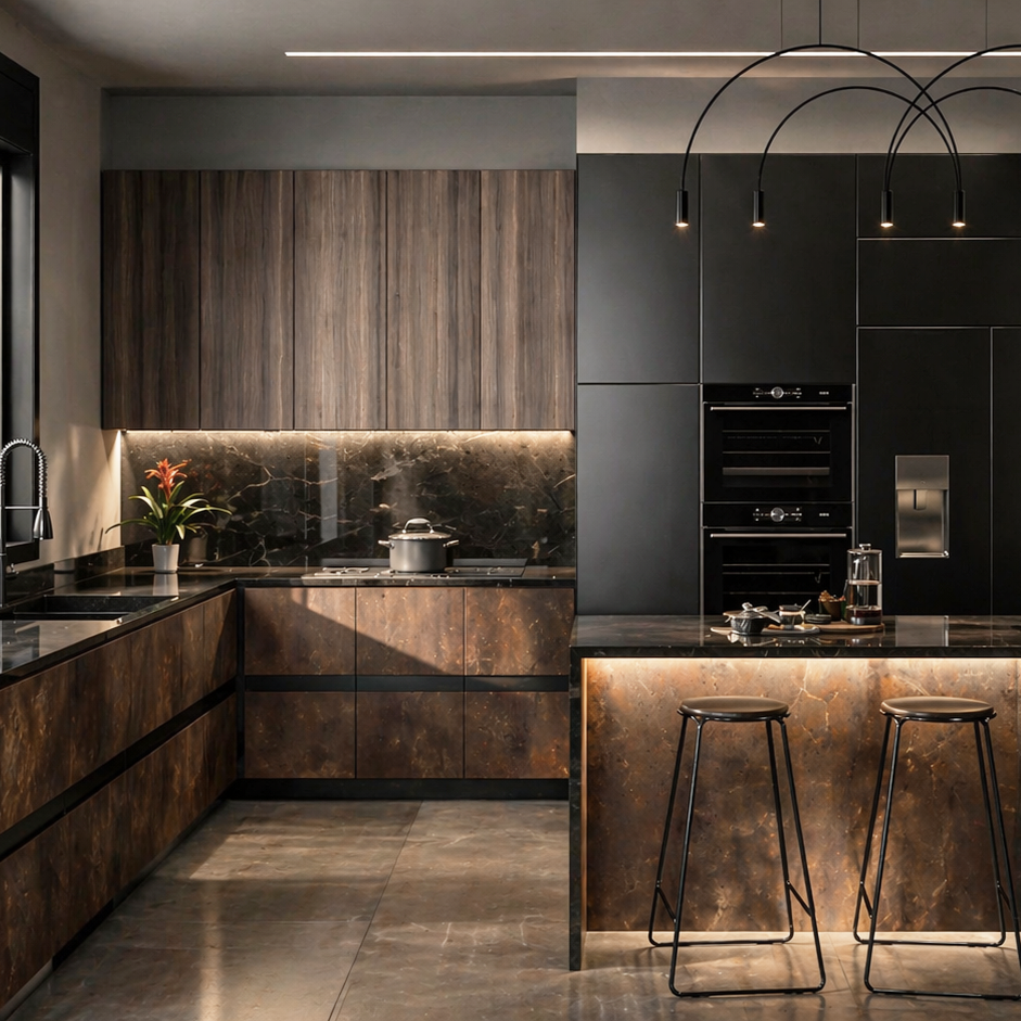 Crafted with precision and elegance, our kitchen design prioritizes practicality and durability for a busy family passionate about cooking. Corten steel with a porcelain finish and matt ash dark wood adorn the doors, ensuring both style and resilience. The luxurious Nero Marquina Marble porcelain from France graces the countertops and backsplash, adding sophistication while maintaining functionality. Embracing warmth and charm, the open layout connects the kitchen to the dining area, fostering interaction and making every cooking experience special for family and guests. This design harmoniously blends modern aesthetics with timeless appeal, creating a space where love and culinary artistry thrive.